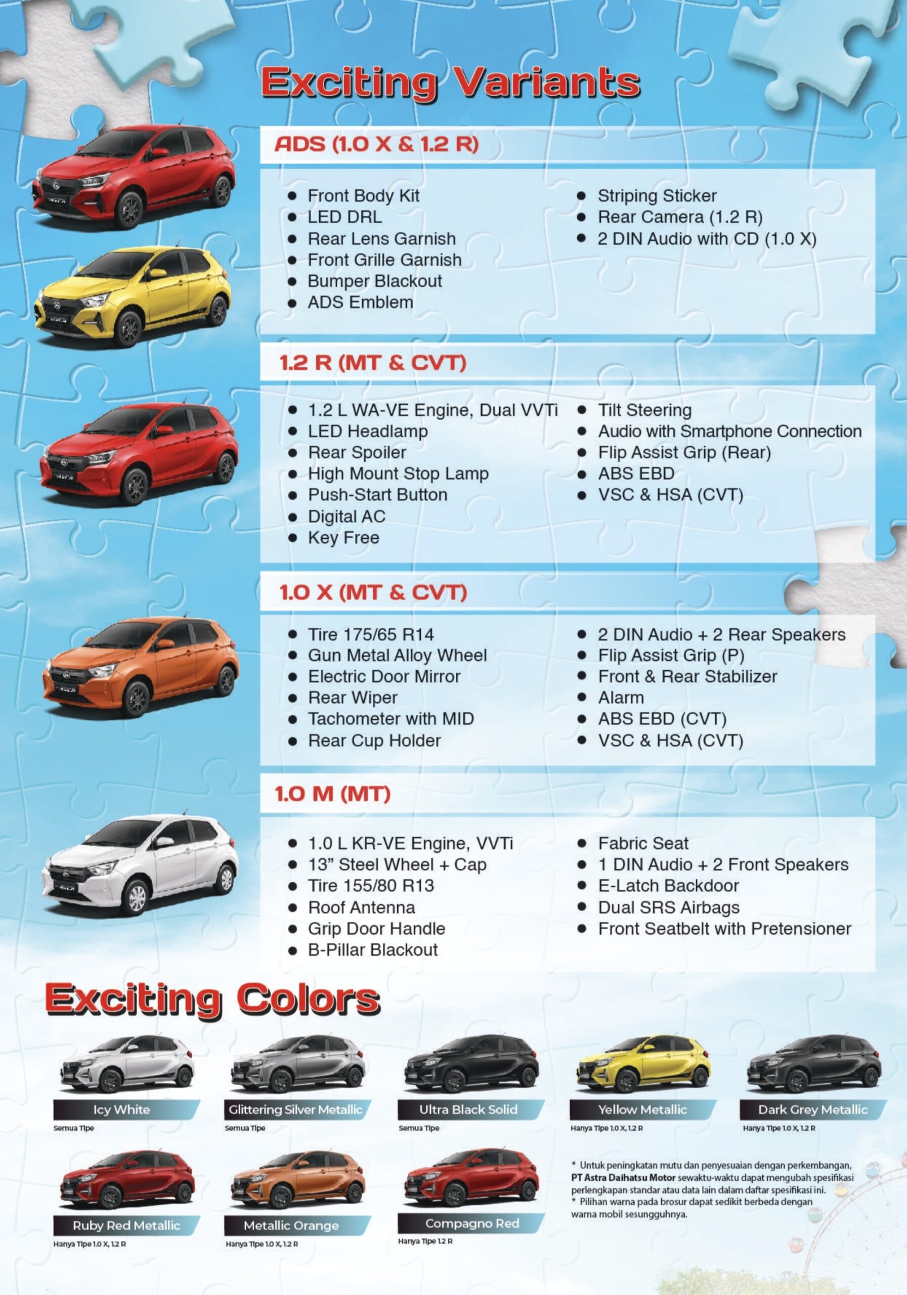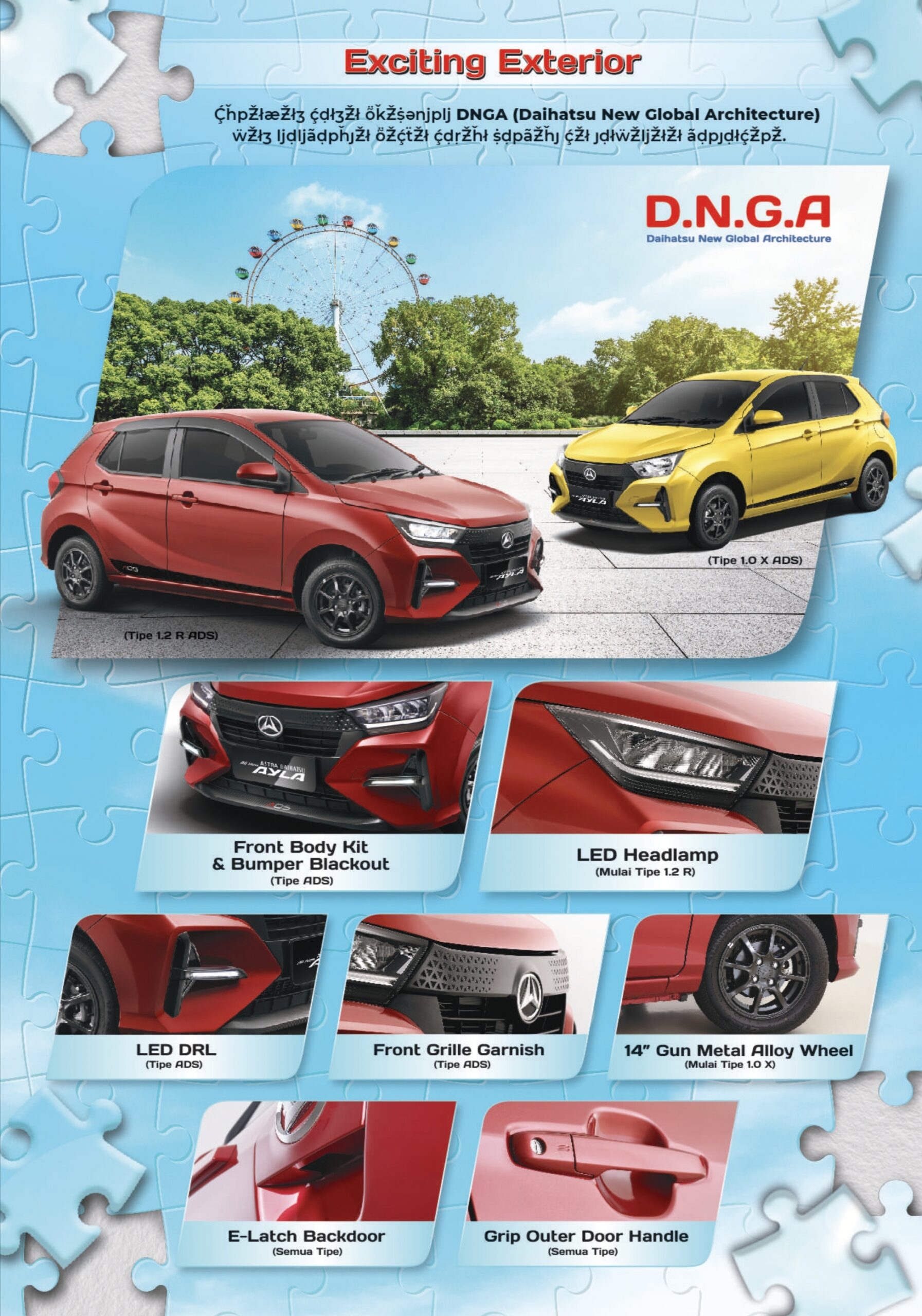 Daihatsu New Ayla meluncur dengan penuh kepercayaan diri akan tetap kokoh di puncak klasemen LCGC bersama saudara sekandungnya, Toyota Agya. Perubahan tak hanya terjadi pada desain eksteriornya saja, tapi mengalami penambahan pilihan mesin dan fitur-fitur pemanja.