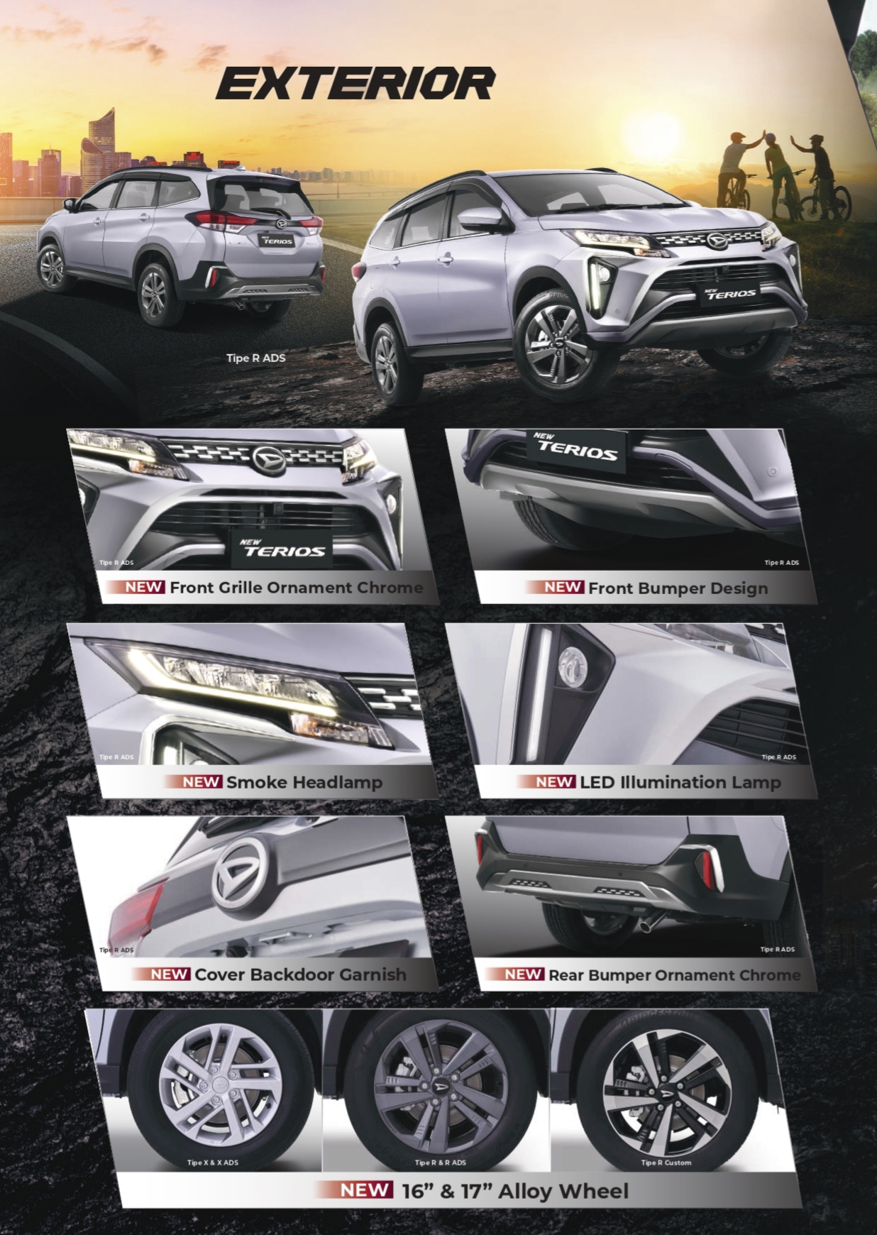 Daihatsu All New Terios membawa perubahan total, tidak hanya dari segi tampilan luar, tapi juga mesin, hingga fitur yang ada di dalamnya. Secara keseluruhan, perubahan yang dibawa sama seperti saudara kembarnya, Toyota All New Rush.